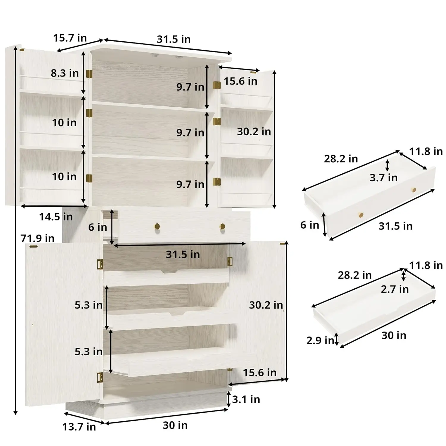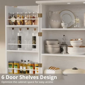 Dimensions: 15.7″ D x 31.5″ W x 72″ H. Each shelf boasts a weight capacity of up to 50 lbs, offering stable and protected storage. This large-capacity cabinet is ideal for spice jars, canned goods, and other small kitchen items